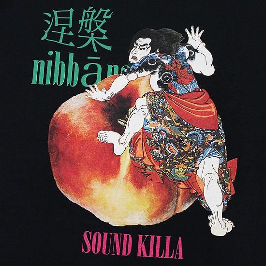 フロントに浮世絵、ピーチ、涅槃の文字をコラージュしたグラフィックプリント、バックの右袖部分にロゴ刺繍を施したデザインのTシャツです。