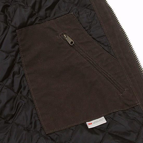 程よいウォッシュ加工を施したダック生地ボディに保温性の高い3Mシンサレート(高機能中綿素材)を採用した中綿キルティング、袖口には摩擦に強い高耐久、高性能なCORDURAナイロンを採用し防寒、機能性に優れています。