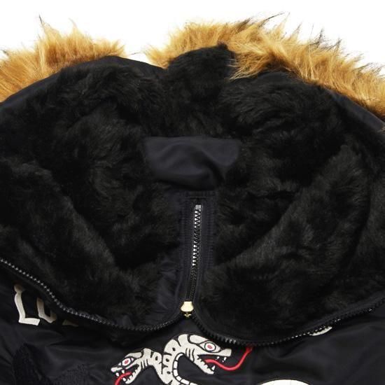 フード周りはフェイクファー、内側はフリースを採用し、フード中央にジッパーがありジッパーを開けてフードを広げられます。