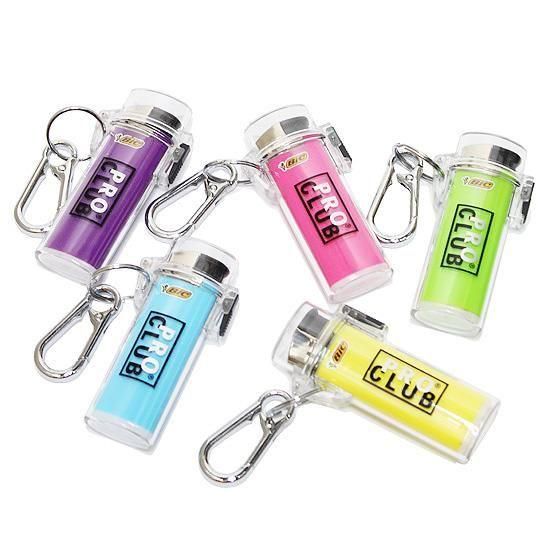 カラビナキーホルダーが付いたプラスチック製のライターケース。